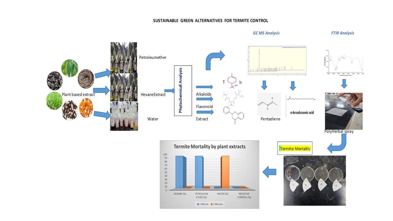 wooden infrastructure, agricultural products, plantations, and stored materials. Although chemicalinsecticides are widely used, their long-term application has led to increasing termite resistance,environmental degradation, and toxicity to non-target species. These drawbacks emphasize thegrowing need for eco-conscious, biodegradable alternatives. Plant-based biopesticides, rich inbioactive metabolites, offer a sustainable and safer approach to termite management.This studyexplores the insecticidal potential of six botanicals—Eucalyptus globulus, Cymbopogon citratus,Syzygium aromaticum, Artemisia absinthium, Citrus sinensis, and Chrysopogon zizanioides—using petroleum ether, hexane, and distilled water as extraction media. Phytochemical analysisconfirmed the presence of key secondary metabolites, including alkaloids, saponins, flavonoids,steroids, carbohydrates, terpenoids, phytosterols, and quinones, while polyphenols,anthraquinones, and cardiac glycosides were absent. Advanced GC-MS profiling identified majorconstituents such as pentadiene and hexadecanoic acid, and FTIR spectroscopy revealed functionalgroups like hydroxyl (O–H), alkene (C=C), halogenated chains (C–C), amines (N–H), and alkylaryl ethers. A distinctive aspect of this research is the comparative solvent-based assessmentshowing extremely rapid anti-termite activity. Hexane and petroleum ether extracts achieved 100%termite mortality within one minute, while aqueous extracts reached full lethality in twominutes.These findings establish the remarkable efficacy of solvent-optimized plant formulationsas natural, fast-acting, and environmentally sustainable alternatives to conventional synthetictermiticides paving the way for safer pest control strategies in agricultural and structural settings.