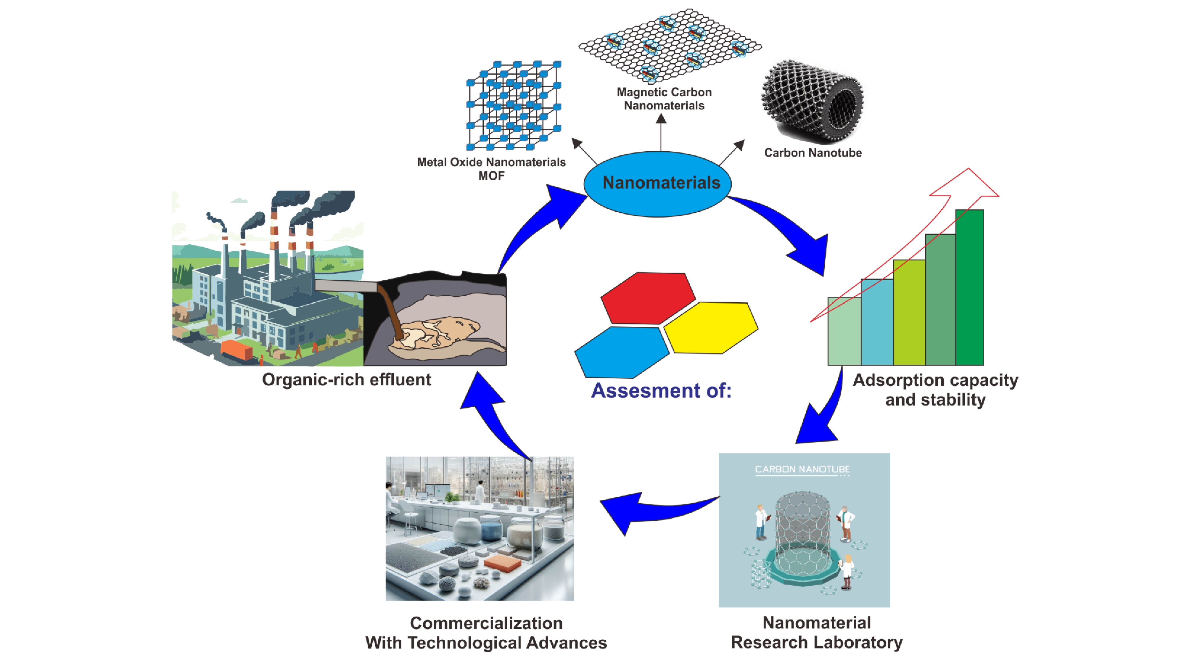 The treatment of organic-rich effluents poses significant challenges in wastewater management due to the complex nature of contaminants and the limitations of conventional treatment methods. This review explores the potential of nanomaterials as advanced adsorbents for the remediation of organic pollutants, highlighting their unique physicochemical properties such as high surface area, tunable porosity, and reactivity. Carbon-based nanomaterials, including carbon nanotubes (CNTs) and graphene, along with metal-organic frameworks (MOFs) and layered double hydroxides (LDHs), demonstrate superior adsorption capacities and stability, making them suitable for diverse effluent compositions. However, despite their promising performance in laboratory settings, challenges such as high production costs, material stability, and scalability hinder their widespread industrial application. This review also identifies key future directions, including technological advancements, scaling up and commercialization strategies, and interdisciplinary research to bridge existing knowledge gaps. By addressing these challenges through innovative research and development, nanomaterials have the potential to significantly enhance the efficiency and sustainability of wastewater treatment processes, contributing to global environmental remediation efforts.