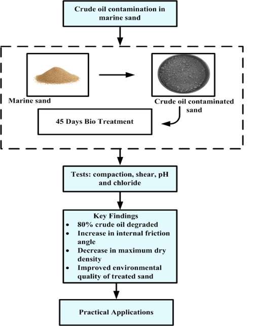 The contamination of marine sand with crude oil (CO) can significantly alter its geotechnical properties, including its strength, compressibility, and permeability. The bioremediation process, which uses microorganisms to break down and eliminate toxins, can alter the structure and composition of the soil, which can further affect these characteristics. Various oil-degrading bacteria have been proven to remove oil contaminants from soil. Their impact on the geotechnical characteristics of polluted materials is not well studied, nevertheless. A bacterial strain called Bacillus amyloliquefaciens, with concentrations ranging from 2% to 12% is used in this study to break down oil pollution from crude oil-contaminated sand. The change in the bioremediation sand's geotechnical characteristics was then determined. Results showed that after 45 days of treatment, up to 80% degradation of crude oil was achieved, with higher bacterial concentrations correlating with increased degradation efficiency. The angle of internal friction increases with treatment duration and bacterial concentration, while the highest dry density decreases with crude oil concentration and chloride content. These findings demonstrate that controlled bacterial treatment not only mitigates contamination but also enhances soil properties, supporting the potential use of biotreated marine sand in offshore foundation construction and as a stable road base material, subject to further field validation.