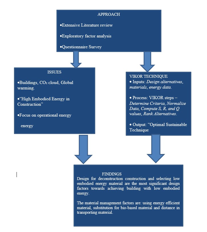 The principle of the embodied energy (EE) has drawn more recognition from various professionals within the construction industry. This is in line with the sustainable development goal (SDG), towards minimisation of environmental impacts and global warming effect caused by construction activities. However, in support of sustainable construction objectives and the reduction of embodied energy (EE) impacts, this study examines EE minimisation techniques in the Nigerian construction industry. This paradigm is important in light of the continuous efforts towards a drastic shift by professionals for less embodied energy structures. This prompts the identification of numerous EE minimisation techniques from literature from four categories consisting of design, material management, manufacturing and policy makers considerations. Subsequently, a mixed method approach consisting of 105 questionnaire survey and three (3) expert opinion survey was conducted to gather insight from the Nigerian construction processionals. A multi criteria decision technique using the provided initial weights, the VIKOR method was implemented to determine the priority ranking of the alternatives. The findings indicate that design for deconstruction and selecting low embodied energy material are the most significant design factors towards achieving building with low embodied energy. The material management factors are: using energy efficient material, substitution for bio-based material and distance in transporting material. The study contributes to sustainable construction by providing a structured framework for prioritizing EE reduction strategies in developing country contexts.