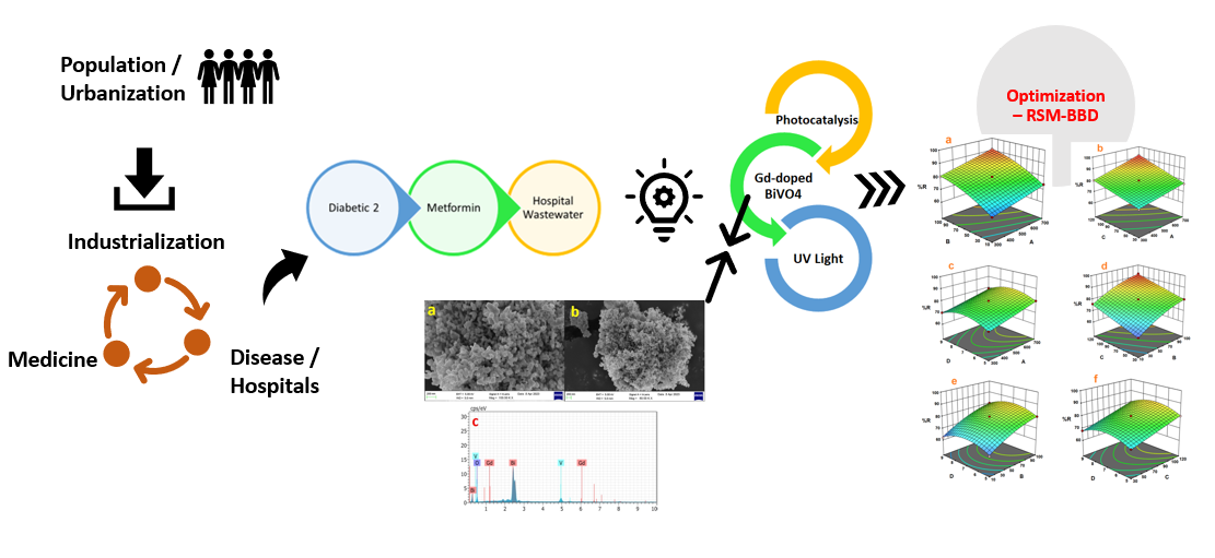 This study aimed to synthesize Gadolinium-doped Bismuth Vanadate (Gd-BV) using co-precipitation and evaluate its effectiveness in removing metformin from hospital wastewater and also optimization done using Response Surface Methodology (RSM), specifically a Box-Behnken Design (BBD). A 5% Gd-doped BV photocatalyst was prepared and tested for metformin removal under UV light. The RSM-BBD approach, implemented with DesignExpert software, explored the impact of initial metformin concentration (300-700 mg/L), Gd-BV dosage (10-100 mg), reaction time (30-120 min), and pH (5-9). The optimal conditions identified resulted in a 92.273% removal efficiency for metformin, achieved with an initial concentration of 595.730 mg/L, a catalyst dosage of 88.404 mg, a reaction time of 115.650 min, and a pH of 7.778. Removal of metformin shows better efficiency of 92.273%.