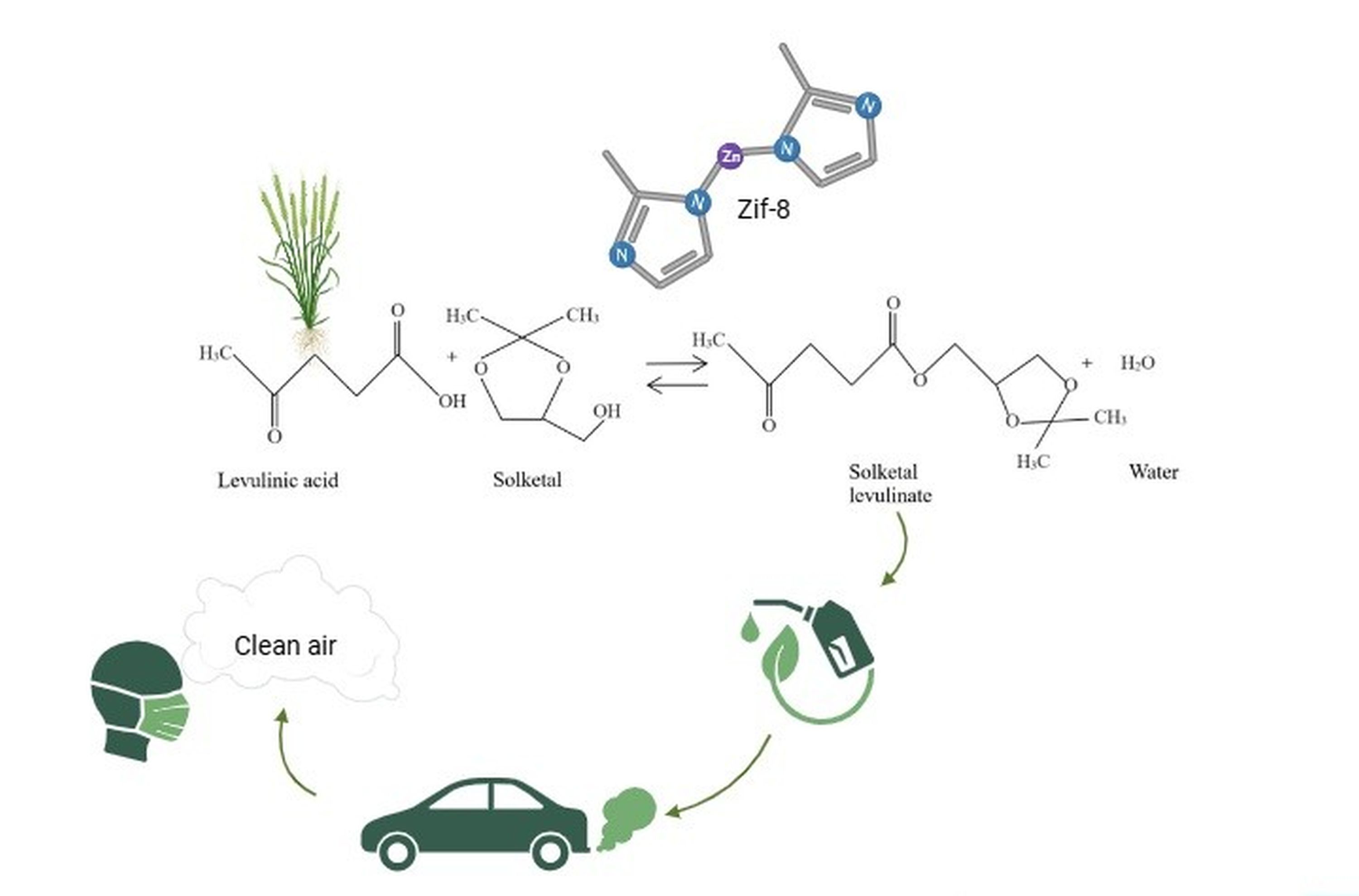 Solketal levulinate (SoLE), a potential fuel additive that can improve the physicochemical properties of the fuel, was produced by the developed catalytic membrane from solketal and levulinic acid. The catalytic membrane was prepared in film form as a metal-organic framework of ZIF-8 supported on a sulfosuccinic acid-loaded hydrophilic polyvinyl alcohol polymer. Removing by-product water from the reaction medium with the sorption of the highly hydrophilic membrane contributed to the conversion. PVA/SSA and PVA/SSA/ZIF-8 membranes were analyzed by FTIR and TGA. ZIF-8 was photographed and analyzed by SEM and XRD, respectively. Higher water affinity of the functional catalytic membranes was calculated by swelling degree and interaction parameter calculations. SoLE synthesis was conducted in the batch reactor under mild conditions. The parameters such as catalyst amount, temperature, solketal/levulinic acid initial molar ratio (M), and reaction time, were investigated. The PVA/SSA catalytic membrane showed a maximum reaction conversion of 97.65% with 105°C, 9 mmol SSA, and an M:6/1 ratio for 6 h. For the PVA/SSA/ZIF-8 catalytic membrane, maximum reaction conversion of 96.81% was obtained at 105°C, with an M:6/1 ratio and 9 mmol SSA for 4 hours. ZIF-8 reduced the reaction time and contributed to the system in terms of efficient energy use.
