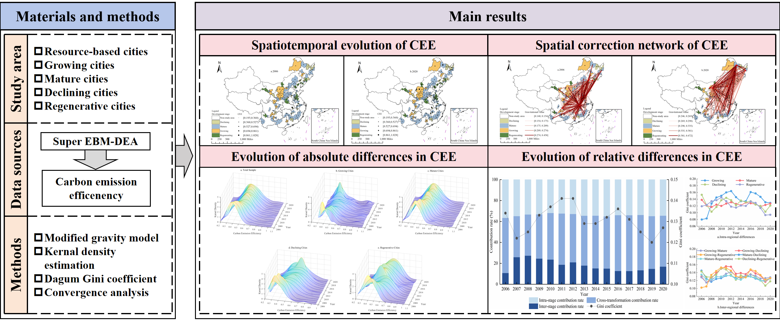 Promoting carbon emission efficiency (CEE) development in resource-based cities (RBCs) is critical for achieving China’s “carbon peak and carbon neutrality” goals. Current studies frequently cluster these cities without adequately considering their heterogeneity across developmental stages (growing, mature, declining, and regenerative). This study innovatively establishes a four-stage analytical framework, applying the super-EBM DEA model to measure CEE in 110 RBCs (2006-2020) categorized by developmental phase. Integrating a modified gravity model, kernel density estimation, Dagum Gini decomposition, and dynamic convergence analysis, the research reveals: (1) Overall, the level of CEE in RBCs has fluctuated but shown an upward trend, with a distribution pattern that follows “regenerative > growing > mature > declining” cities. (2) The spatial correlation network of CEE of RBCs is characterized by multiple nodes and threads intertwined, which feature spatially proximate correlations and inter-regional connections, with the latter being the dominant mode. (3) Regional differences in CEE among RBCs have generally decreased, although polarization within growing cities remains pronounced. Transvariation density makes the most contribution to the overall Gini coefficient. (4) CEE in RBCs at the overall level exhibits σ convergence, absolute β convergence, and conditional β convergence in space. Each of the four city types shows distinct spatial effects. Factors such as economic development levels, advancements in green technology, and industrial structures have heterogeneous impacts on CEE across RBCs. RBCs should adopt robust carbon emission reduction measures tailored to their unique conditions, facilitating the formation of a reasonably divided, highly efficient, and collaborative framework for reducing carbon emissions.