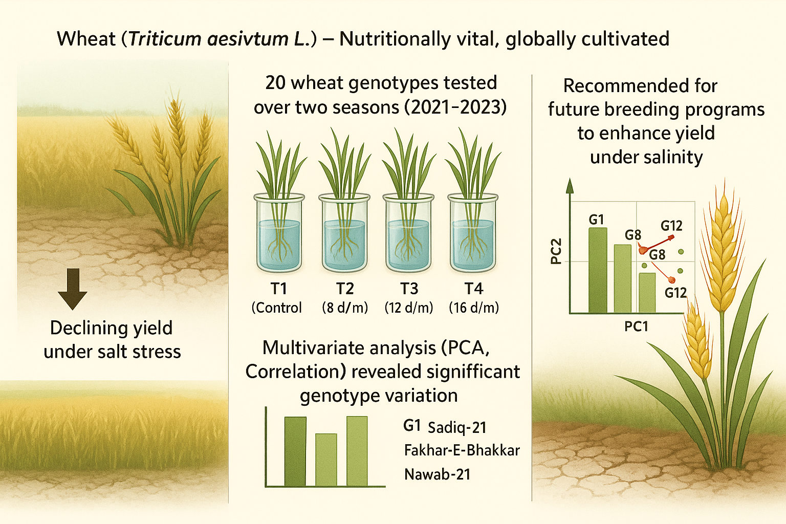 Wheat (Triticum aestivum L.) is a cereal crop cultivated around the world. It is an important crop for human due to its high nutritional value. The overall production of wheat is decreasing every day while its consumption has increased. Salt stress is an important abiotic stressor affecting wheat from growth to harvest. It is main factor limiting wheat output, development, and growth. The current study used 20 diverse wheat genotypes for two consecutive growing seasons in 2021-2022 and 2022-23, to assess their salt tolerance potential against four treatment levels (control, 8dS/m, 12dS/m and 16 dS/m) using various quantitative attributes like plant height (PH), peduncle length (PL), spike length (SL), flag leaf area (FLA), chlorophyll content (CC), grain length (GL), grain width (GW), grain area (GA), thousand grain weight (TGW) and yield per plant (YPP). Significant amount of differences in genetic diversityamong genotypes using studied traits was observed. Correlation analysis showed a positive association of these traits among each other under all treatment conditions. Principal component analysis (PCA) revealed that, among the 10 PCs, only two had eigenvalues >1 and were significant across all treatments cumulatively accounting for 70.49%, 60.67%, 60.62% and 51.562% of the total variation under T1 (control), T2 (8dS/m), T3 (12dS/m) and T4 (16dS/m) conditions respectively. Additionally, the biplot result of PCA revealed Sadiq-21 (G1), Fakhar-E-Bhkkar (G8) and Nawab-21 (G12) as potential salt tolerant genotypes. In order to produce high yielding and salt tolerant genotypes, future wheat breeding programs may utilize the tolerant genotypes with salt tolerance potential.