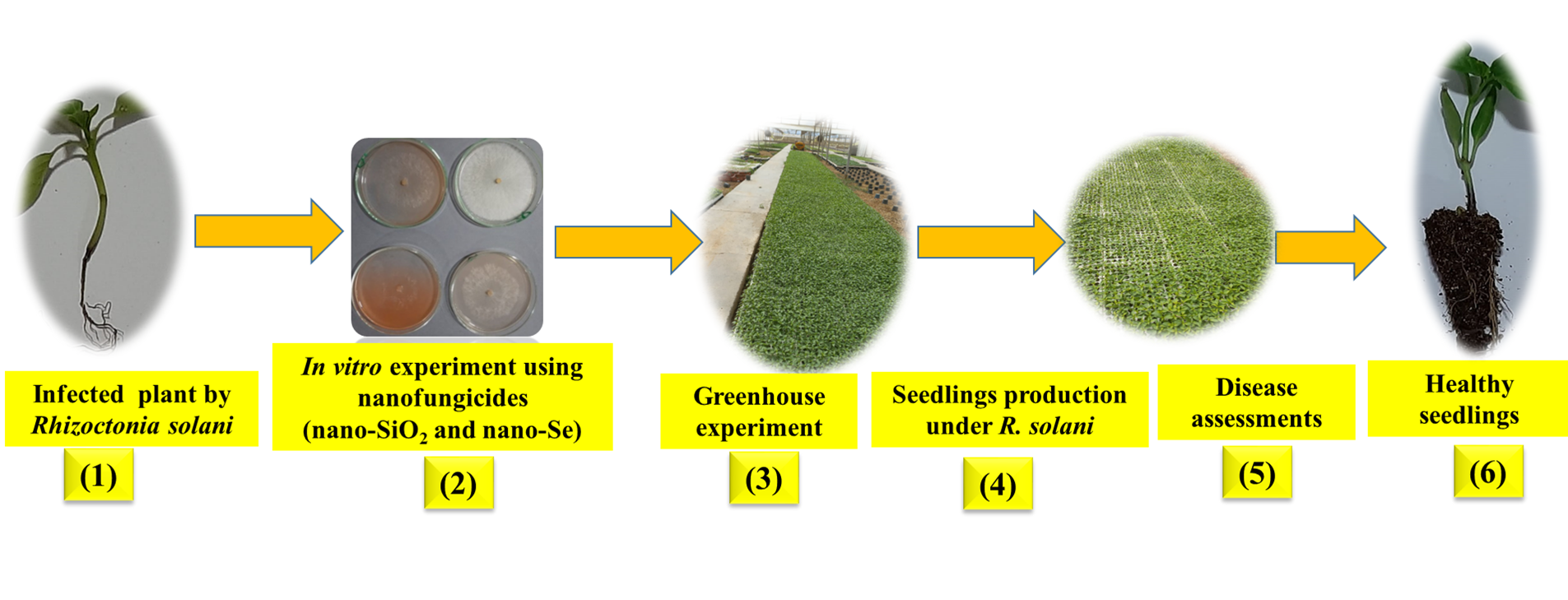 There is an urgent need to find sustainable alternatives to chemical pesticides for protecting the environment and healthy food as well as enhancing seedlings quality. Therefore, the current study is an attempt to find nano-alternatives to chemical fungicides for protecting pepper seedlings (Capsicumannuum L.) production from the phytopathogen of Rhizoctonia solani and to promote pepper seedlings’ growth and quality by individually applying n-SiO2, n-Se and combined n-SiO2 and n-Se together under the nursery conditions. Single and combined applied doses of nano-silica (200 mg L-1) and nano-selenium (100 mg L-1) were treated pepper seedlings for controlling the root rot disease of R. solani. Applied nanosilica (200 mg L-1) was showed the maximum values in the studied vegetative growth of pepper seedlings, enzymatic antioxidants and the photosynthetic parameters under the fungal infection. The suggested mechanism of applied nano silica in boosting the growth of pepper seedlings against R. solani was confirmed by the SEM images of infected seedlings (control) and treated ones by nanosilica. The same trend was observed of such behavior of enzymatic antioxidants after treatment by nanosilica resulting from enhancing the resistance of pepper seedlings against studied fungal pathogen. This priority was followed by the nano-Se, then the combination of both. This study, as a new report as we know, opens a new window towards the possible nanofungicides against the studied fungal pathogen (R. solani) to reduce the application of chemical fungicides and ameliorate pepper seedlings growth and quality. Further research is needed concerning new nanoparticles and new phytopathogens.