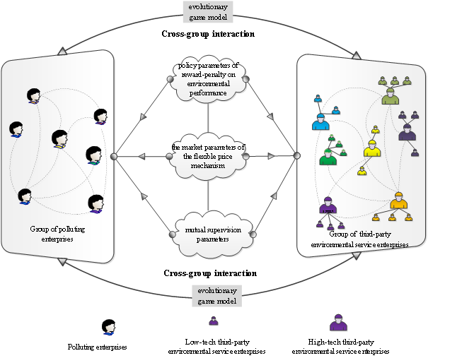 Given the practice of third-party environmental pollution governance (TEPG), this paper proposes evolutionary game model to study the collaborative mechanism of the main participants and guide the optimization of the third-party service market’s technological environment towards sustainability and high quality. Initially, the model integrates the government’s policy parameters of reward-penalty on environmental performance, the market parameters of the flexible price, and mutual supervision parameters between polluting enterprises and third-party environmental service enterprises. Subsequently, a two-dimensional dynamic system is constructed to explore the collaborative governance path within TEPG, deducing theoretical analysis results on evolution trajectory and boundary conditions essential for optimizing the third-party technological environment. Finally, A real-world case is taken as an example to evaluate the proposed model and investigate the impact of the three previously mentioned controllable parameters on the TEPG system’s evolutionary process. The findings suggest that the TEPG dynamic system can evolve in various directions, driven by the synergistic effects of policy, market, and supervision, which balance the profit and loss in environmental governance. This synergy fosters the development of effective collaborative governance strategies. Positioning the heterogeneous effects of market price mechanism in different development stages of TEPG practice, supplemented by policy and supervision instruments to meet the boundary conditions for optimizing the technological environment, it can facilitates steering TEPG market towards sustainable and high-quality development. Additionally, stimulating the endogenous motivation of participants to control pollution, alongside leveraging external resources, significantly accelerates the adoption of collaborative behaviors for polluting enterprises and third-party environmental service enterprises.