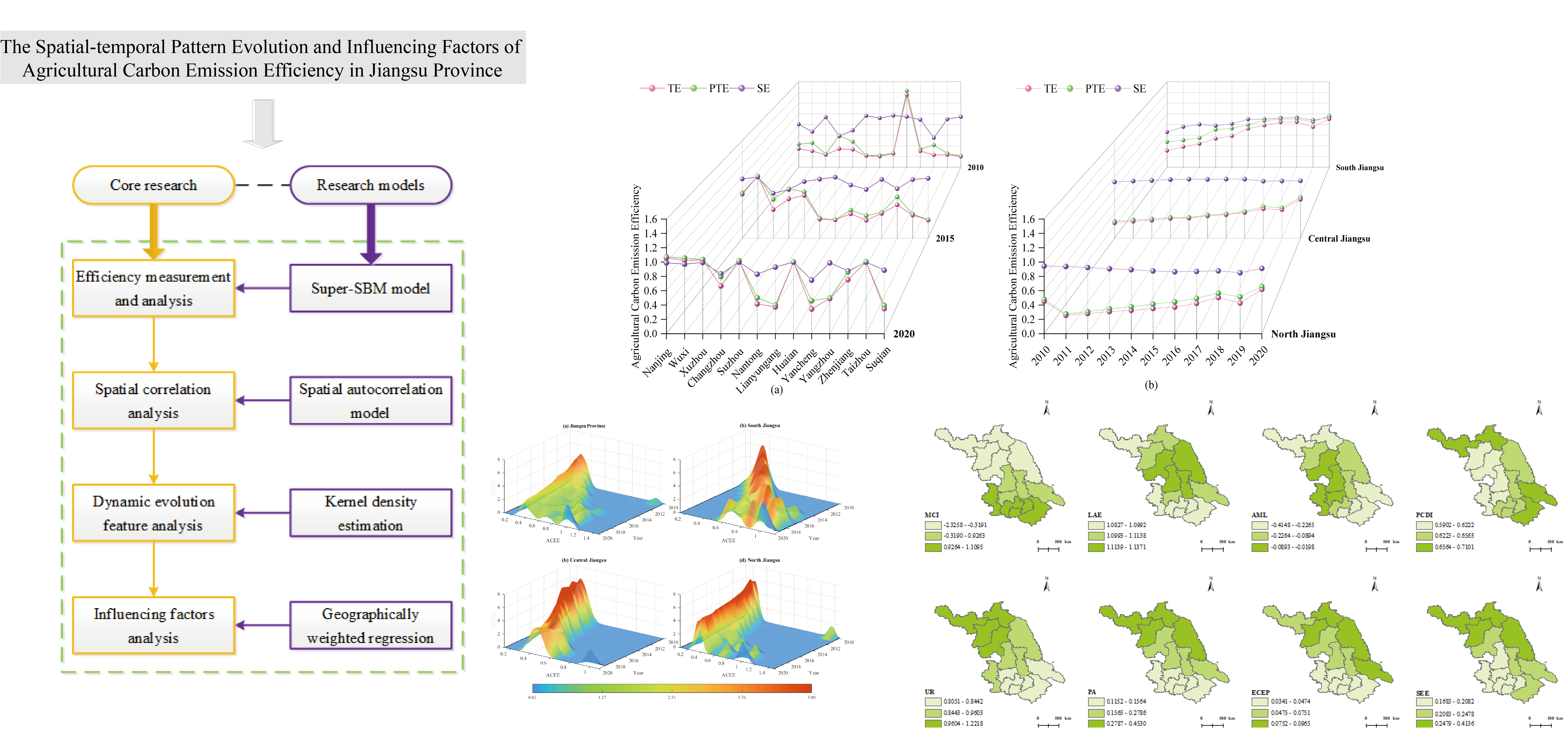 Agriculture, as a pillar sector of the national economy, plays a crucial role in influencing the quality of the ecological environment through its carbon emissions. Jiangsu Province is a major agricultural region in China. Measuring agricultural carbon emission efficiency (ACEE), analyzing its spatiotemporal evolution characteristics, along with the influencing factors are of great significance for advancing the achievement of agricultural sustainable development goals in Jiangsu. This paper focuses on the 13 prefecture-level cities in Jiangsu Province and initially conducts a quantitative assessment of the carbon emission efficiency in the agricultural sector from 2010 to 2020 using the Super-SBM model. Subsequently, the paper investigates the temporal and spatial evolutionary characteristics of ACEE using spatial autocorrelation models and kernel density estimation. Finally, the paper employs the geographically weighted regression method to systematically analyze and interpret the key factors influencing efficiency. Based on the empirical research findings, three main conclusions can be drawn. (1) Regarding efficiency levels, the carbon emission efficiency in Jiangsu Province's agricultural sector has gradually improved, but it remains relatively low overall, with significant efficiency loss issues. (2) In terms of spatiotemporal evolution, the ACEE in Jiangsu Province improves over time and exhibits positive spatial clustering characteristics in space. (3) Concerning influencing factors, MCI, labor-land allocation efficiency, and other factors all have a significant impact on ACEE.