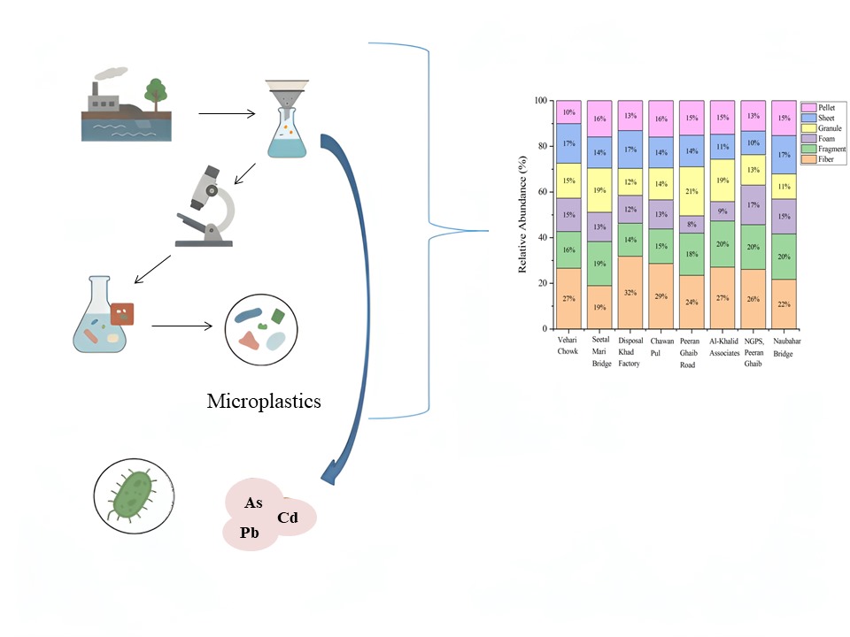 Microplastics (MPs) are ubiquitous primarily in aquatic environment where they travel freely from one place to another. Higher surface area with strong hydrophobicity made them a perfect candidate to sorb different pollutants in aquatic ecosystem. This study investigates occurrence and distribution of MPs in Qasimpur canal running in Multan city and carry large quantity of sewage waste and industrial effluents. Results describe that MPs concentration is between 25 and 6 MPs L-1. Relative distribution of MPs shows that fibers (32.01%) were prevalent in water sample followed by fragment (20.39%) while sheet and pellet were least among water samples. Weight distribution of MPs types also exhibit that fibers were dominated in water. MPs were also distributed on the basis of color where blue and white is dominant colors among all. It was attributed that possible intrusion of MPs in water is through sewage sludge and industrial effluents. Among heavy metals arsenic, cadmium and lead were detected in water. Concentration of HMs is high enough to make water hazardous as given in heavy metal pollution index (HPI). HMs was added into water through industrial effluents but MPs act as vector in transporting them in flowing water. Similarly total coliform and E.coli were detected in high concentration making negative relationship with water ecosystem. Findings from current work provide insight in accumulation, distribution and abundance of microplastics with in flowing water. Synergistic effect of MPs and HMs poses greater risk to aquatic ecosystem and organisms.