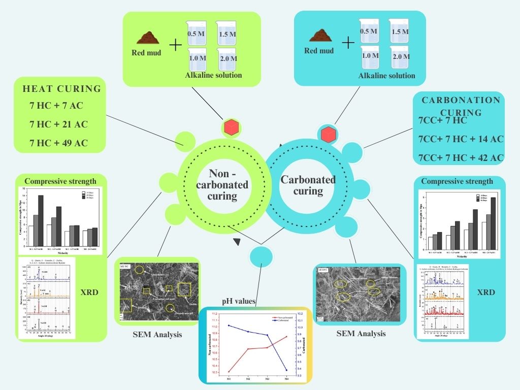 This research explores using low molarity sodium hydroxide (NaOH) in alkali activated red mud based geopolymer mortars to enhance sustainability. Carbonation curing was employed to capture CO2 and promote mineral carbonation. The study assessed how NaOH molarity (0.5M to 2M) affects physical, mechanical, microstructural properties and statistical analysis through compressive strength, pH, crystalline characterization, microstructural analysis before and after carbonation and ANOVA analysis. Non-carbonated samples showed highest compressive strength at 0.5M NaOH, while carbonated samples peaked at 2M. Red mud's natural alkalinity enhanced strength at low NaOH concentrations in non-carbonated conditions. Carbonated samples showed greater strength at 2M due to higher Na⁺ availability. XRD analysis identified geopolymer reaction products and unreacted phases in non-carbonated samples, while carbonated ones showed sodium carbonate. SEM showed dense N-A-S-H gel at 0.5M in non-carbonated samples and zeolite needle formations and sodium carbonate crystals in carbonated samples at 2M. pH increased with higher NaOH concentrations in non-carbonated samples and decreased after carbonation. ANOVA revealed curing period affects compressive strength of red mud geopolymer mortar, with M1-M3 gaining strength while M4 stabilized early. Results indicate red mud's alkalinity enables effective geopolymerization at lower NaOH concentrations, while higher NaOH concentration enhances CO2 sequestration through carbonation curing, highlighting potential for sustainable applications.