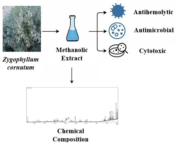 Zygophyllum cornutum is recognized for its traditional medicinal use among certain populations in the northern Sahara of Algeria for different conditions, including hypertension and diabetes. The current study sought to ascertain the chemical composition and efficacy of Zygophyllum cornutum methanolic extract (ZcME) regarding cytotoxicity, antihemolytic properties, and antibacterial activity by agar diffusion experiment. Thirty-four bioactive phytochemical components were discovered in the methanolic extract of Zygophyllum cornutum. The identification of phytochemical substances relies on retention duration, molecular weight, and molecular formula. The study's findings first suggest that the methanolic extract of Zygophyllum cornutum is non-toxic at dose levels up to 20 mg/ml. ZcME had significant antimicrobial efficacy against Escherichia coli, exhibiting progressively larger inhibition zones at elevated concentrations (ranging from 8 mm at 5 mg/mL to 23 mm at 40 mg/mL), with all MIC/MBC values equal to 1, indicating the extract's bactericidal properties. At a concentration of 1.25 mg/mL, ZcME and ascorbic acid demonstrate equal antihemolytic activity (26% vs. 28%), indicating that, at this low dosage, ZcME may possess equivalent efficacy to ascorbic acid in safeguarding red blood cells from lysis.