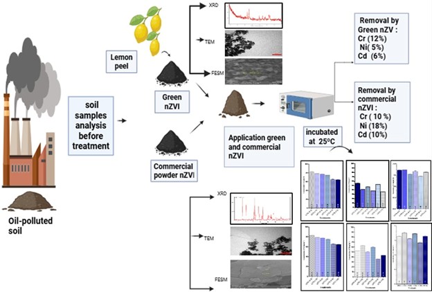 Soil contamination by heavy metals poses serious environmental risk. This study investigated soils impacted by refinery discharges from Gwer Road, Erbil, Iraq, focusing on soil physicochemical properties, baseline contamination, and nanoscale zero-valent iron remediation. Soil samples were collected from southern and northern sites at 50 m and 200 m distances and 30 cm depth. Soil texture, pH, and cation exchange capacity varied between sites, affecting heavy metal distribution. Chromium (52.85-79.54 mg.kg⁻¹), nickel (41.10-63.42 mg.kg⁻¹), and cadmium (1.41-1.76 mg.kg⁻¹) exceeded Environmental Baseline Standards (EBS), indicating refinery-derived pollution. The study evaluated the remediation potential of green-synthesized nZVI from lemon peel extract and commercial nZVI. Nanoparticle characterization using FESEM, TEM, and XRD confirmed nanoparticle size, core-shell shape, and crystallinity. Application of 0.5 g/kg soil provided 12%, 5%, and 6% removal efficiency for Cr, Ni, and Cd using green nZVI, compared to 10%, 18%, and 10% using commercial nZVI. Although green nZVI removes chromium similarly, it is sustainable, locally sourced, and cost-effective. Remediation efficacy was influenced by soil properties, baseline contamination, and nanoparticle characteristics. This study represents the first application of green and commercial nZVI for the remediation of refinery-affected soil, providing a sustainable approach for mitigating heavy metal pollution and enhancing industrial site management.