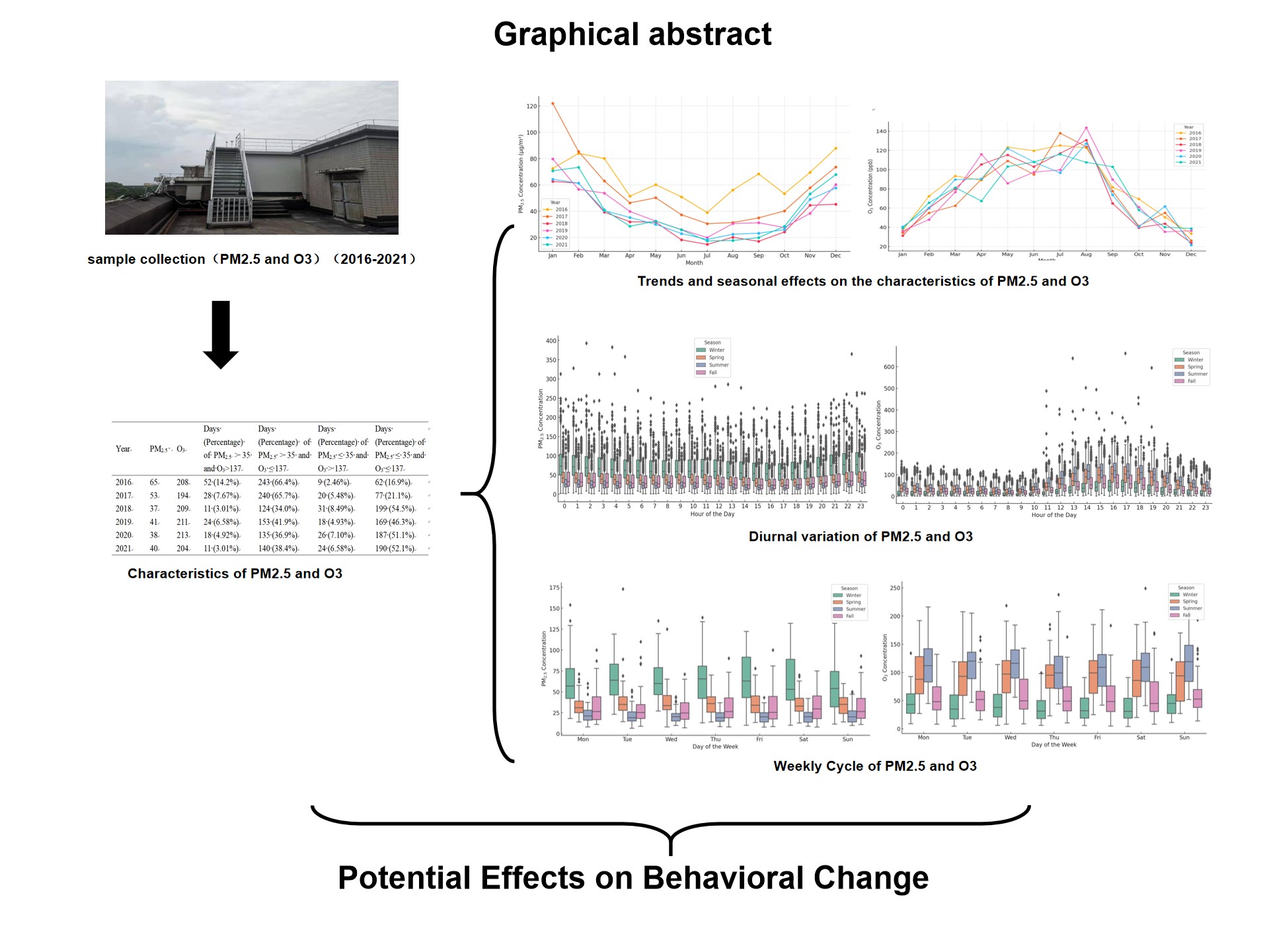 Abstract:Objective: This study aims to establish time- and scenario-specific behavioral recommendations for vulnerable populations, based on the pollution characteristics and meteorological drivers of PM₂.₅ and O₃ in Luzhou (2016–2021), with the objective of mitigating health risks associated with air pollution. Methods: Hourly data on pollutants and meteorological factors were acquired from Luzhou Environmental Monitoring Station of Sichuan Province. After going through strict quality assurance and control procedures, an effective data collection rate of 96.6% was achieved, temporal distribution and influencing factors were analyzed. Results: A significant decreasing trend in PM₂.₅ concentrations was observed, whereas O₃ levels remained persistently elevated (194–213 μg/m³) during the observation period. PM₂.₅ levels peaked during winter nights (21:00–2:00), while O₃ concentrations were highest in the summer afternoons (14:00–15:00). which was closely related to the meteorological conditions (temperature and humidity) in this area. Conclusions: Although a reduction in PM₂.₅ levels, O₃ pollution continues to pose a significant challenge. It is recommended that outdoor activities be avoided during winter nights and outdoor exercise be minimized during summer afternoons. Vulnerable populations should limit prolonged exposure when O₃ concentrations exceed 160 μg/m³. These targeted behavioral interventions can effectively reduce acute exposure risks and contribute to public health management.