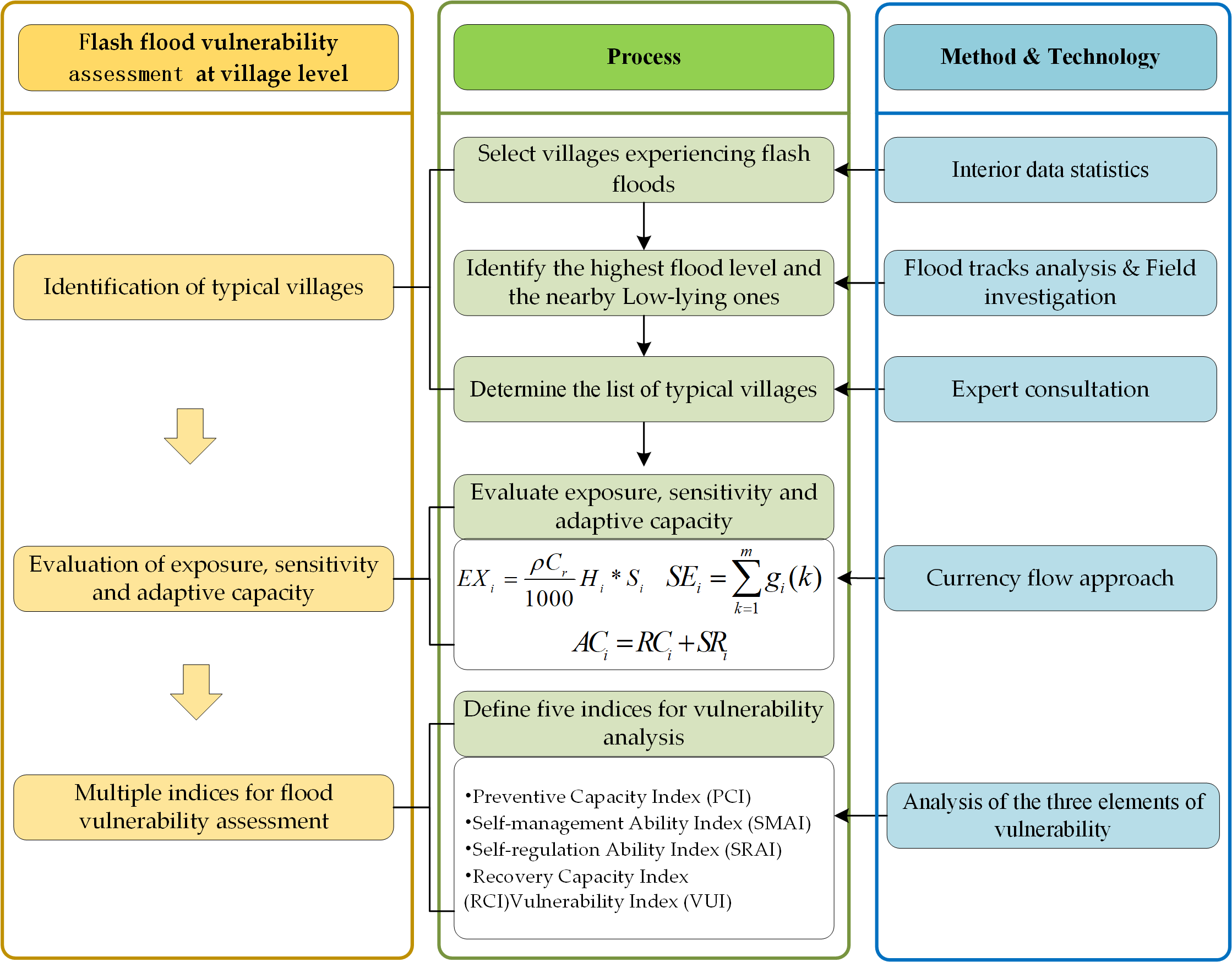 In recent years, flash floods have caused significant losses in most areas of the world. However, the assessment of flash flood vulnerability is lacking and weak, especially for the rural areas at village level in China. This work introduces a novel currency flow approach to analyze the flash flood vulnerability for typical villages of Baoting County in Hainan province, China. The typical villages are selected and identified by expert consultation and field investigation of flood events. The three elements of flood vulnerability like exposure, sensitivity and adaptive capacity are measured in monetary form with a currency flow approach. The multiple indices are developed to analyze flash flood vulnerability in terms of the relationships of the three elements. Results show that most identified typical villages of Baoting County have the relatively large values of Vulnerability Index (VUI). The numerical results in the study area for VUI, SMAI, SRAI and PCI fall within the ranges of 0.86-8.58, 1.6-21.79, 0.13-1.76, 0.008-0.26 and 0.11-1.26. It is essential to increase the investment in engineering and non-engineering measures especially in villages of Sidui (SD), Yidui(YD) and Shenjin(SJ), for more resilient to the effects of flash floods. The NSE result of the standardized numerical value of transferred population in the historical process of flash flood disasters and the standardized numerical value of flash flood vulnerability assessment ranking results is is 0.747, indicating that the accuracy of the currency flow approach is high. The currency flow approach proposed in this work reveals the relationships between exposure, sensitivity and adaptive capacity, identifying village and element of vulnerability that need strengthened against flash flood. The work findings will have a promising application prospect in flash flood management.