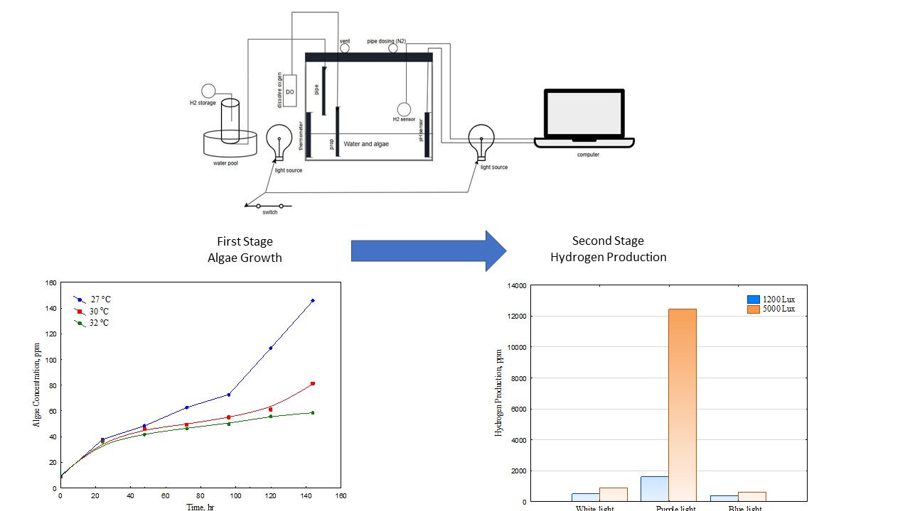 The increasing demand for sustainable energy sources worldwide has led to an upsurge in the consideration of biologically produced hydrogen as an alternative clean energy resource. In this regard, the current research investigates the eco-efficient production of biohydrogen from the algal organism Chlorella vulgaris using an optimized two-stage hybrid process, which combines algae growth enhancement and hydrogen production through the use of nutrients. A thorough examination of the effects of culture medium formula, light spectrum, intensity, phosphate level, temperature, and pH levels on algae growth and hydrogen production was carried out. The findings revealed that algal growth was optimal in NPK (20:20:20), indicating a well-balanced nutrient composition compared to BG11 and industrial wastewater growth medium, which is essential for stimulating growth in Chlorella vulgaris for sustainable biohydrogen production. However, the results obtained indicated that algae growth and hydrogen production were optimal under conditions characterized by controlled limitations in phosphate levels at 0.4 ppm, establishing the nutristategic approach as an essential requirement for enhanced hydrogenase activity in biohydrogen production. In the context of light sources examined within the study, the effect of violet lights at an intensity of 2000 lux had a practical enhancement approach for both algae growth and hydrogen production, establishing the energy synergistic requirement based on photobiology aspects for effective algae growth stimulation and enhanced biohydrogen production based on the algal photosynthesis process. Additionally, the Response Surface Methodology approach based on the Box-Behnken design addressed an optimal growth process for algae at a pH requirement of 6.58 and a temperature requirement of 27.57 °C, advocating for the need to achieve