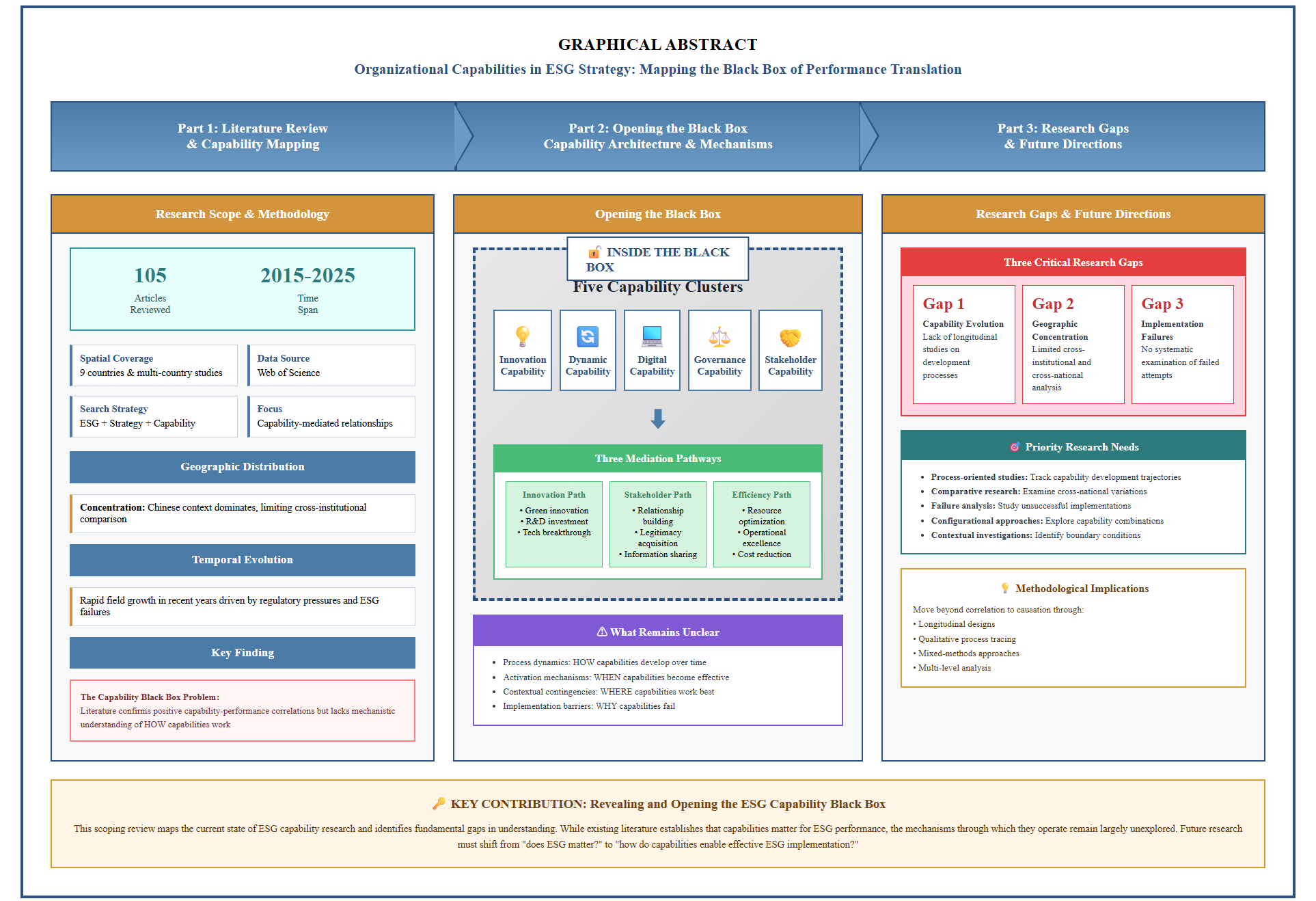 The current state of organizational capabilities within the field of environmental, social, and governance (ESG) strategy is specified in this scoping review, in order to fuel the process of identifying significant gaps in the area of knowledge. The literature focus is observed to be grounded on five kinds of capabilities (innovation, dynamic, digital, governance and stakeholder) and their positive correlation with the ESG performance after conducting a review of 105 articles (2015-2025). Such capabilities operate in the ways of utilization of resources more efficiently and the coordination of stakeholders in a better way. Three major gaps were identified, such as limited knowledge regarding the development of capabilities and processes, excessive dependence on the Chinese context (41.9% of papers) that limits inter-institutional comparison, and no focus on the failures in implementation. The role of asking the complex question of how and why of capability building in the field is shrouded in the focus on quantifiable, correlation studies. This review recommends longitudinal, cross-national comparative and process-oriented studies on such neglected areas. It aims at charting a path towards the demystification of the black box of the ability in ESG practice.