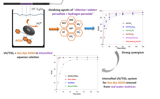 Real matrix validation using river water, seawater, and mineral water confirmed the robustness of the process, maintaining >90% degradation efficiency despite the presence of interfering ions. These findings demonstrate that TiO2-based photocatalysis, intensified with oxidizing agents, represents an efficient and sustainable approach for treating dye-polluted effluents.