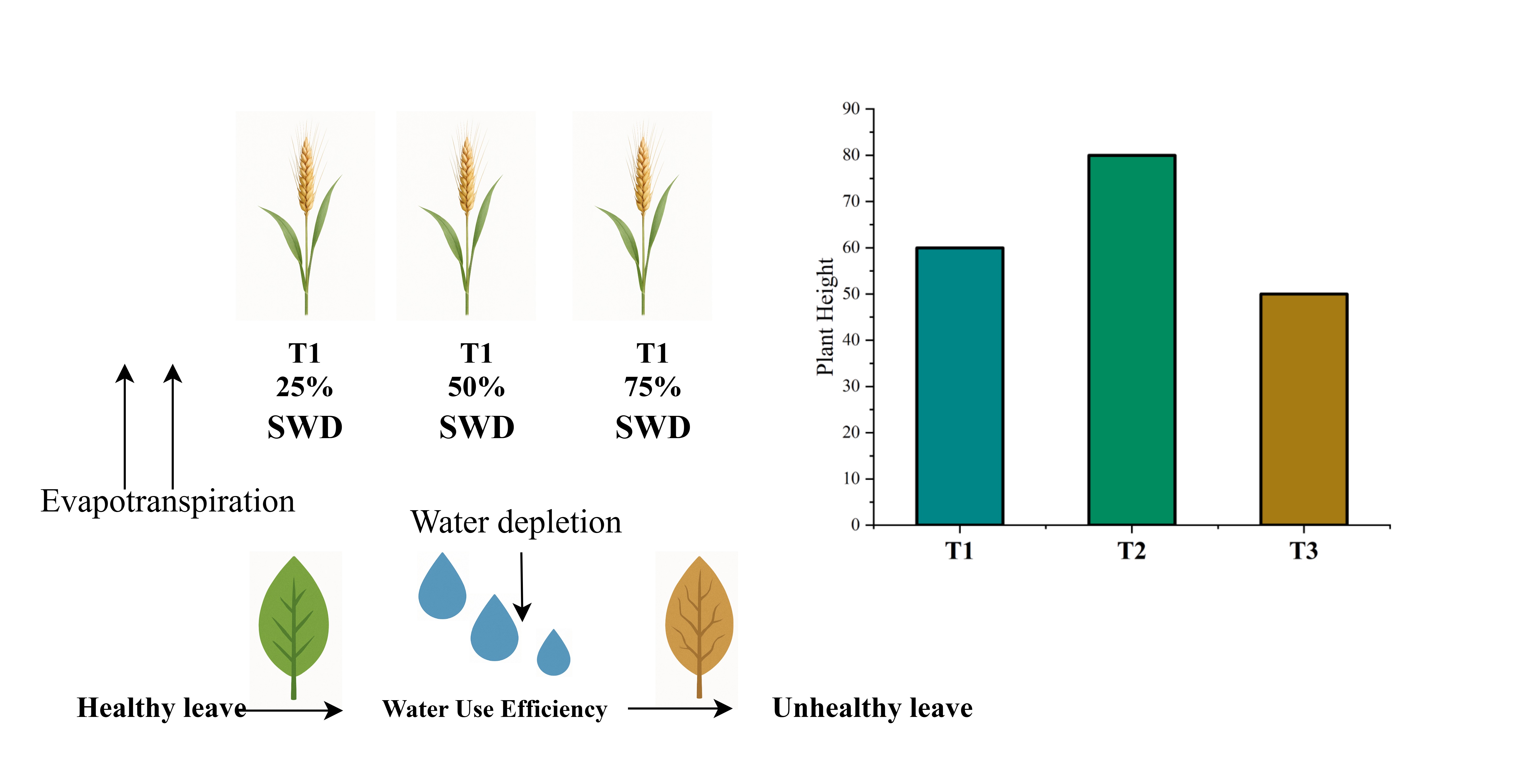 For water conservation and good agricultural management, especially in a semi-arid climate zone, it is important to accurately estimate how much water crops use. While large lysimeters are often expensive and difficult to handle, mini-lysimeters provide a cost-effective and practical alternative. The current study evaluates the performance of mini-lysimeters in determining crop evapotranspiration (ETc), water use efficiency (WUE), and establishing crop coefficients (Kc) for different wheat growth stages from November 2022 to May 2023. The experimental design contains three soil water depletion (SWD) treatments: T1; 25% SWD, T2; 50% SWD, and T3; 75% SWD, with four replicates using mini-lysimeters. The findings indicate that the daily actual evapotranspiration (ETa) of wheat ranged from 0.23 to 10.3 mm, while the seasonal ET fluctuated annually, spanning from 634 to 698 mm. However, among all soil water depletion treatments T2 has shown significant (P < 0.05) effects on wheat growth parameters, including the maximum plant height, highest spike length, numbers of tillers and the total weight of 86.8 cm, 10 cm, 137 cm, and 0.59 kg, respectively. The highest WUE was observed in T1, as it produced a relatively good yield with less water, making it the most water-efficient treatment. In contrast, T3 showed the lowest WUE due to excessive water application without proportional yield benefits. These findings suggest that a 50% SWD treatment is optimal for wheat cultivation in arid and semi-arid regions.