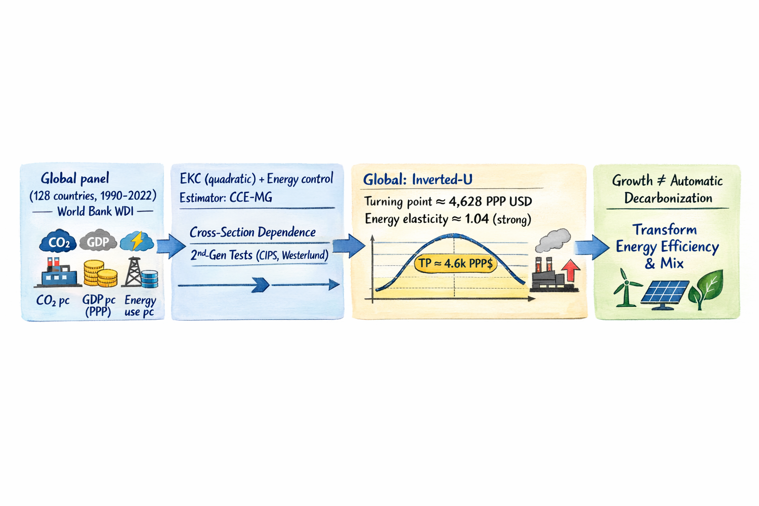 This study re-examines the Environmental Kuznets Curve (EKC) hypothesis within a rigorous methodological framework, focusing on the mediating role of energy consumption across a global panel of 128 countries (1990–2022). Utilizing second-generation econometric techniques to account for cross-sectional dependence (Pesaran CD, CIPS, Westerlund), we employ the Common Correlated Effects Mean Group (CCE–MG) estimator to address both unobserved common shocks and parameter heterogeneity. Our full-panel results provide evidence for a conditional inverted-U pattern, with an average turning point of approximately 4,628 PPP USD. However, the high elasticity of emissions relative to energy use (lnTOE \approx 1.04) indicates that decarbonization is driven more by energy intensity than by income growth alone. Furthermore, disaggregated analysis reveals that the EKC is not a monolithic reality; statistically consistent evidence is primarily confined to low-industrialization economies (IND4). These findings suggest that environmental recovery is not an automatic outcome of rising per-capita income. Instead, sustainable development requires targeted policies that prioritize energy efficiency gains and a structural transition toward cleaner energy mixes.